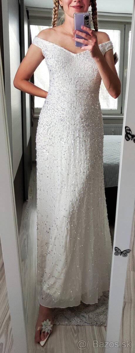 Krásne svadobné šaty, plisované L, cena 100€, na ramienka korzetové L, cena 120 eur, s flitrami 85 eur.Prosím nevolať, len písať!
