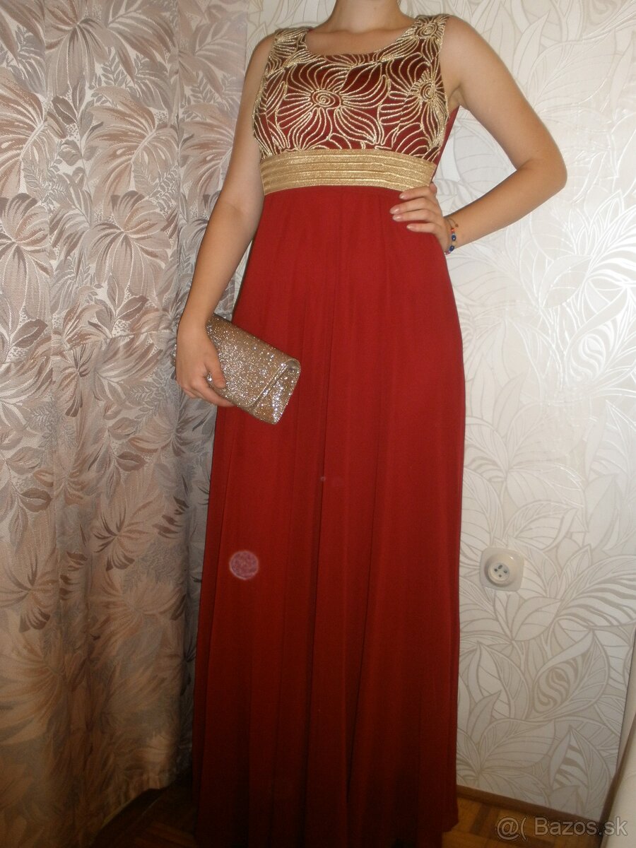 Predám dlhé spoločenské šaty, veľkosť 38, farba bordó s vyšívaným živôtikom zlatou niťou - floristický motív, ako nové.