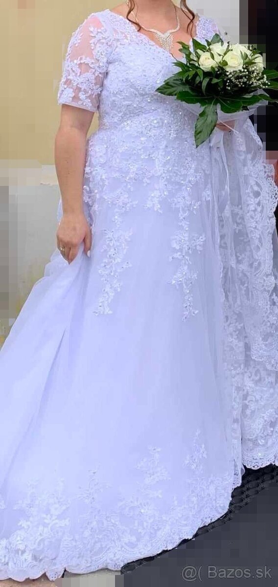 Svadobné šaty plus doplnky - [10.2. 2026]Ahojte, predám svoje svadobné šaty. Veľkosť tak 36 - 38, ale skôr menšia 38, ale urcite sa daju upravit. Moja výška je 160 cm plus mala som nižšie opätky. Šaty sú s V-čkovým výstrihom vpredu aj vzadu. Majú odopínateľné závoje na rukách. Sú krásne trblietavé, naživo oveľa krajšie ako na fotkách.