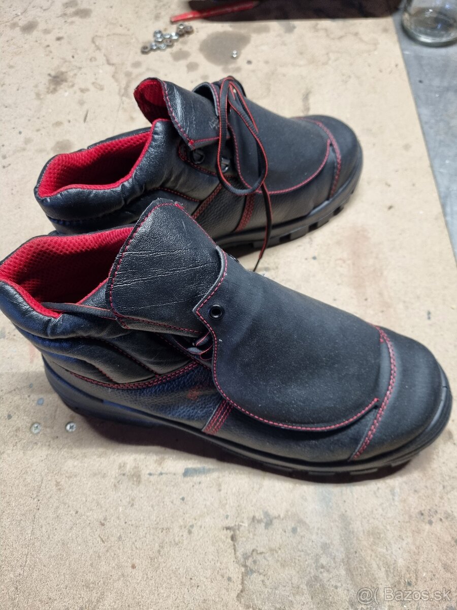 Pracovné bezpečnostné kožené topánky s oceľovou špičkou, čierno-červené, nikdy nenosené. Z vnútra sú mäkké, podrážka antistatická, protišmykové - oil resistant, s ochranným prekrytím na šnúrky. veľkosť 46