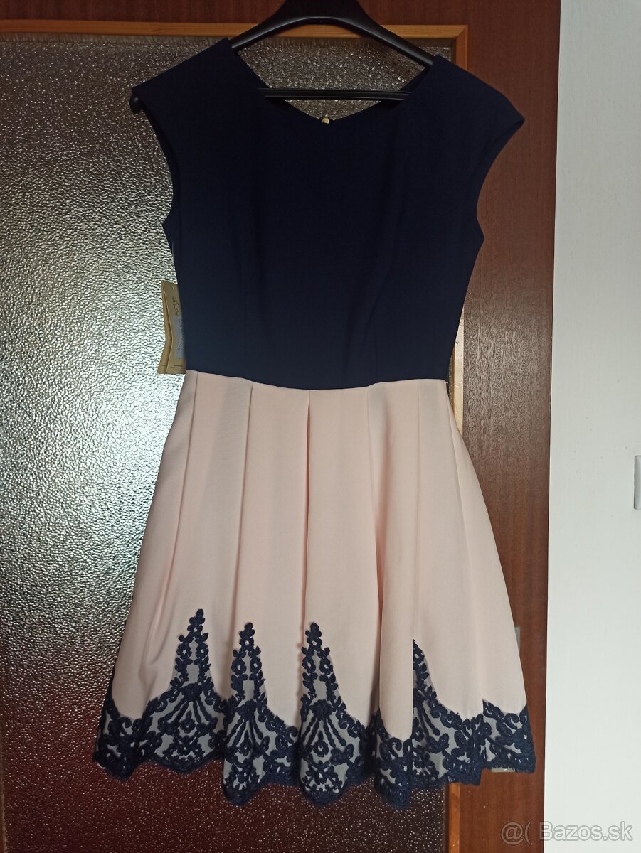 Nové s visačkou, veľkosť S. Farba bledunko ružová s tmavomodrou. Sukňa nazberkaná, robí krásne áčko vďaka pevnejšej spodničke. Je k nim aj stuha na viazanie okolo pása. Inzerát platný do zmazania, kontakt prosím cez formulár, číslo vymyslené.