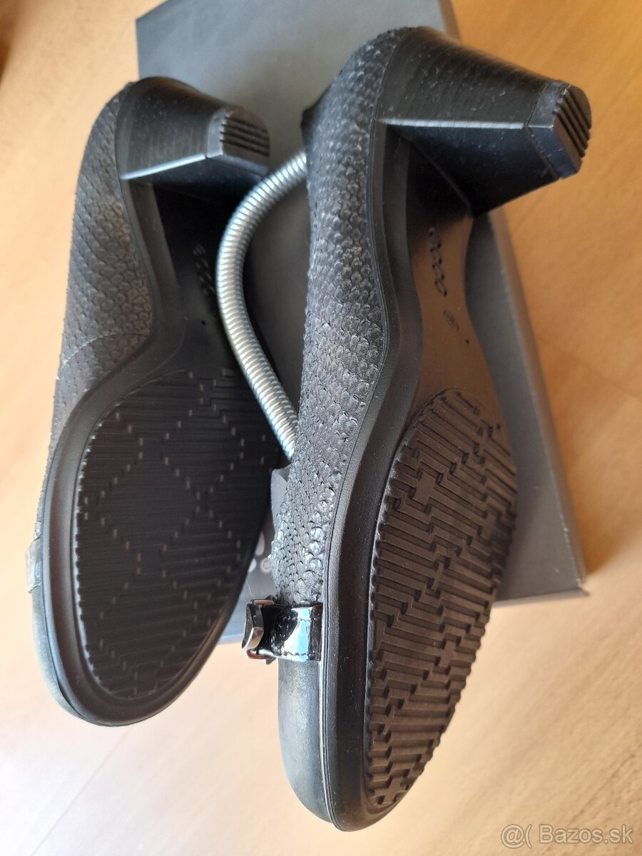 Par krat obute kozenne lodicky vel.39, zn. Ecco - [31.12. 2025]Par krat obute kozenne lodicky zn. Ecco. Vyska podpatku 4 cm merane v obluku, 6 cm merane z vonkajsej strany vzadu. Sirka vlozky v najsirsom mieste 8 cm. Bez poskodenia. Vid foto.