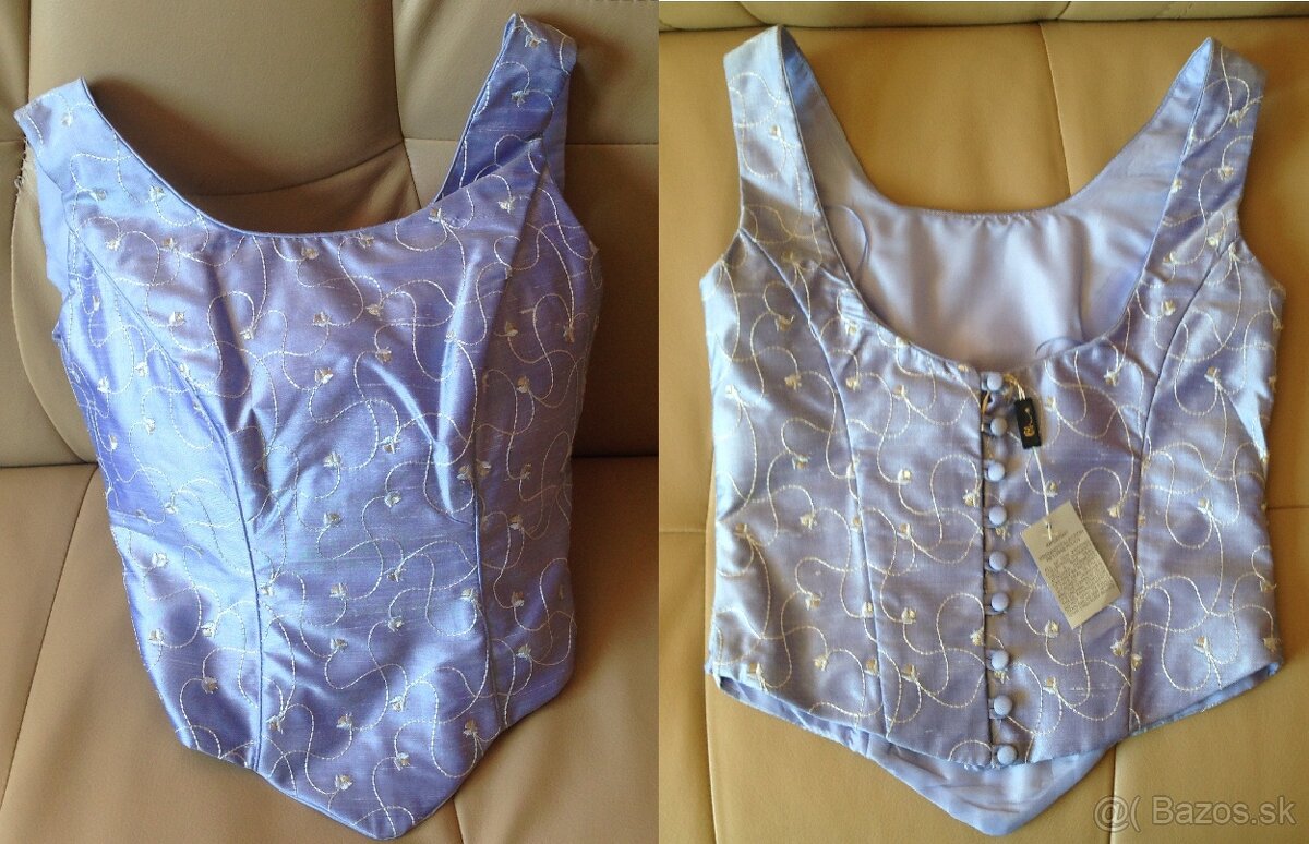 Predám hodvábny korzet na spoločenskú udalosť (oslava, stužková, svadba, ples...) - svetlo fialovej farby, zapínanie na gombičky, vôbec nenosený (nesadla mi veľkosť); uvedená VEĽKOSŤ: 38; podľa rozmeru skôr 36 - obvod hrudníka meraná zvnútra: 81cm, ostatné miery viď foto. Materiál 100% hodváb - silk, podšívka 100 % polyester. Cena 15€.