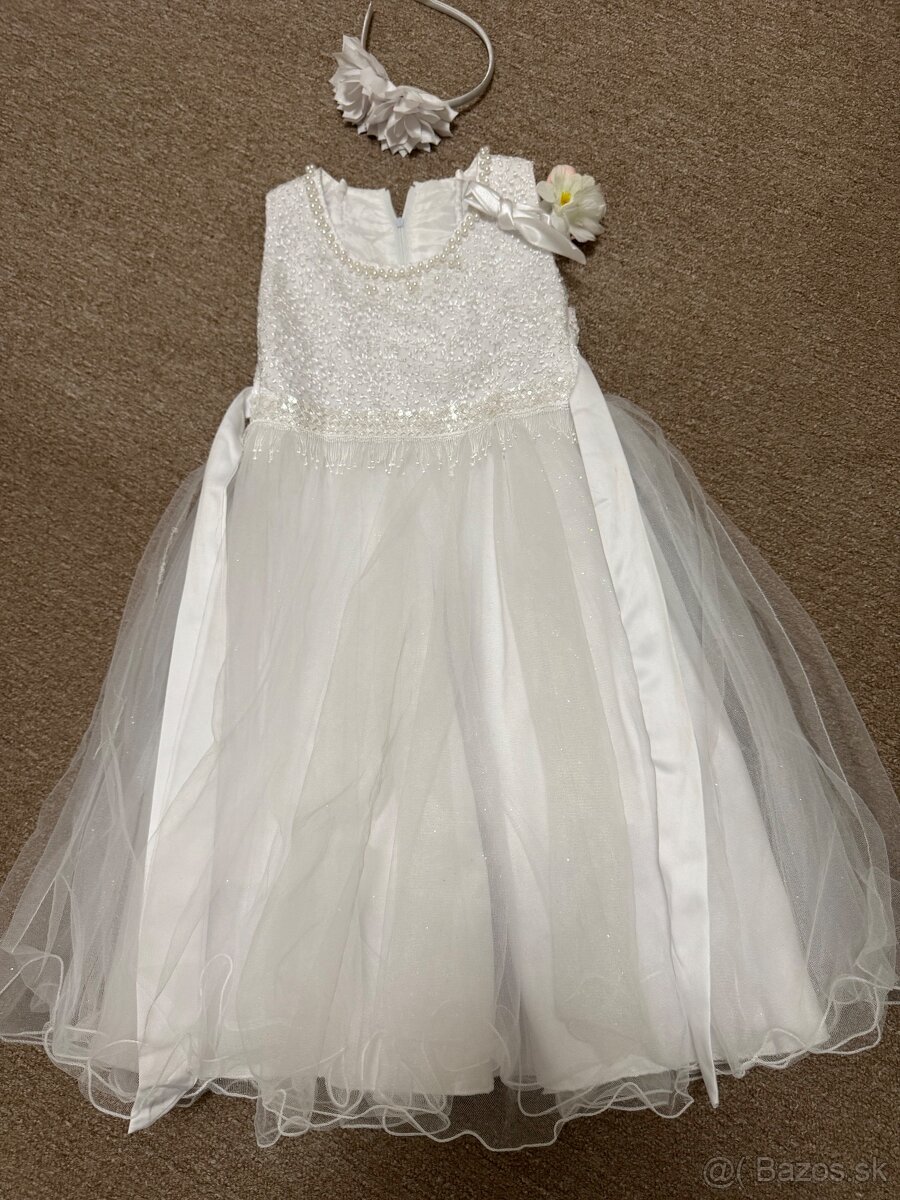 Predám dievčenské slávnostné biele šaty. Veľkosť pre 5-8 ročné dievča. Vhodné pre malú družičku. Súčasťou je aj čelanka.