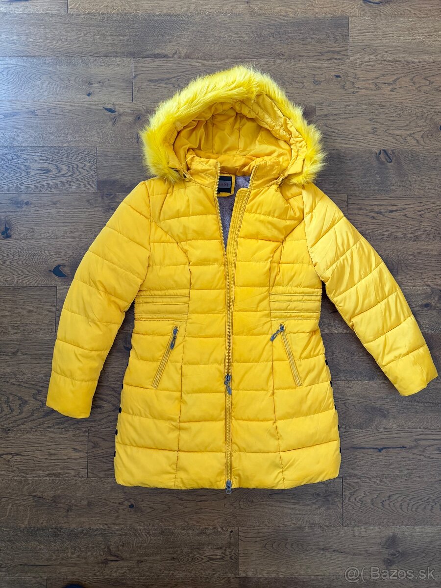 Dámska žltá zimná bunda - [10.2. 2026]Predám dámsku žltú zimnú bundu s hnedou kožušinou na krku a goliery, pri vačkoch a zipse hnedá koženka, zipsy zlaté.