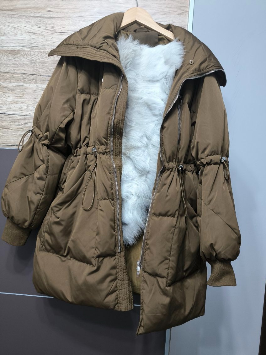 Predam uplne novu zimnu bundu,hnedej farby.Velkost L.Kupena v Polsku.Chlpata cica na foto je golier,ktory sa da pripnut na bundu pomocou gombikov.Dovod predaja-je mi velka.miery na vyziadanie.