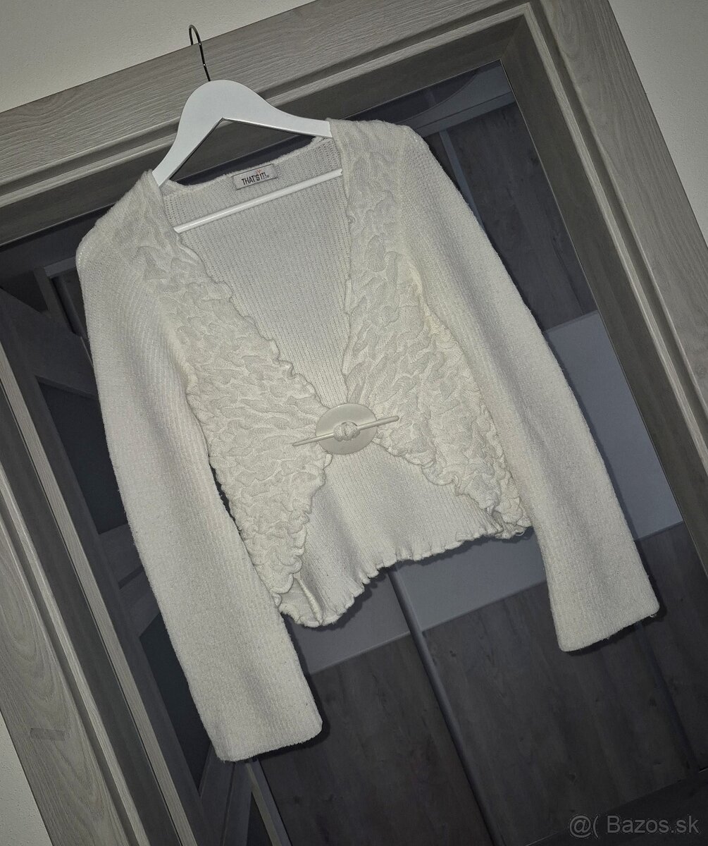 Biely svetrík zn. THAT´S IT! s rozšírenými rukávmi a ozdobnou sponou, d.51cm, š.2x40cm, 2x oblečený, bez chyby, zloženie- 95% akryl, 5% elastan, PC vysoká, teraz 10€+poštovné.