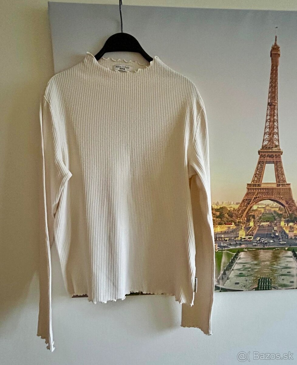 Predám tričko s dlhým rukávom krémovej farby značky Marc O'Polo Denim, vlnité zakončenie rukávov, vyvýšenej časti pri krku aj dĺžky. Veľkosť M, rozmery: hrudník 49x2 cm, rukáv 69 cm, dĺžka 64 cm. Zloženie: 80% viskóza, 20% bavlna. Vhodné na celoročné nosenie, v zime aj ako spodná vrstva