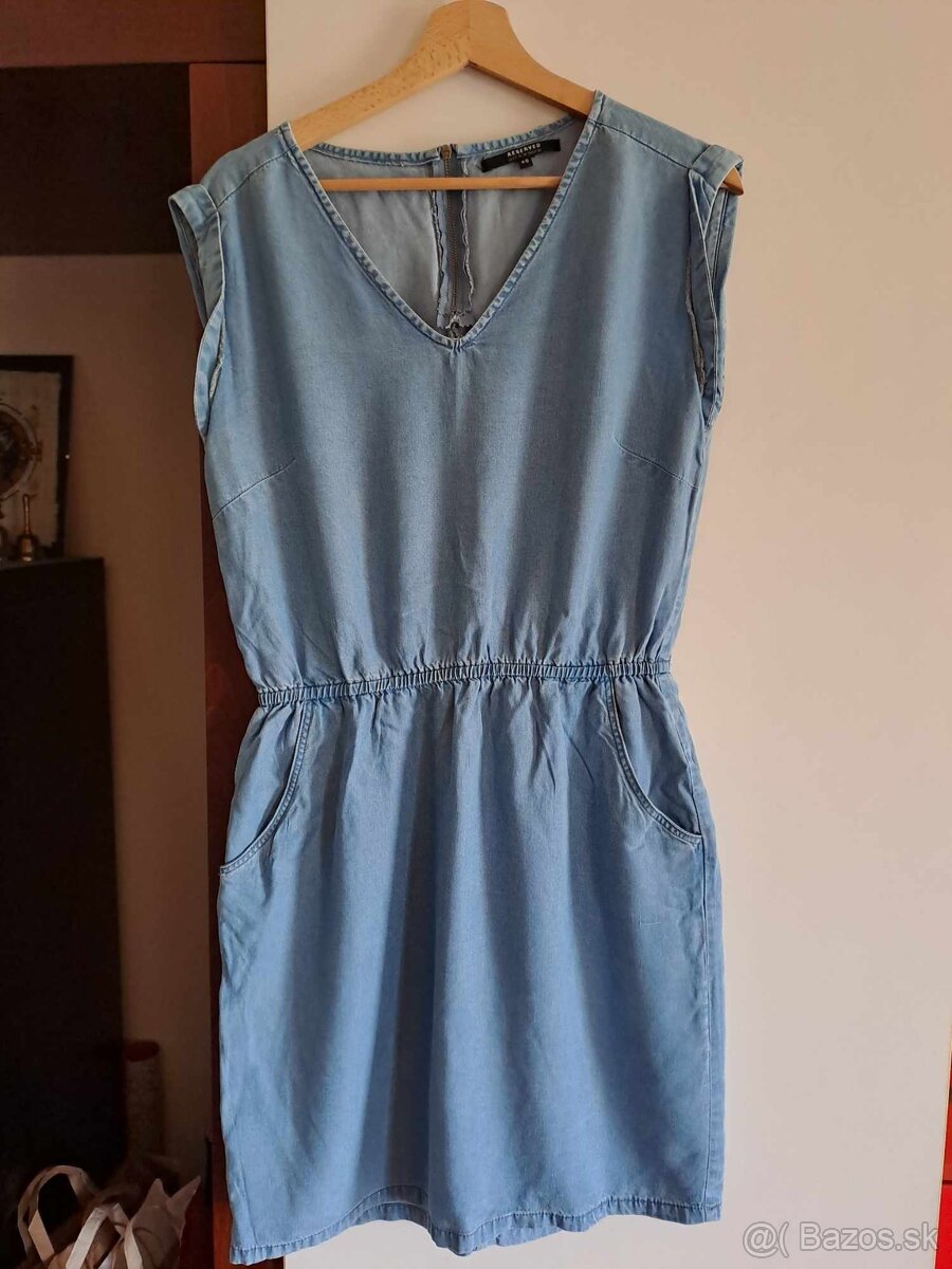 Letné riflové tenké šaty. 2 vrecká, vzadu hore zips, v páse guma, velkost 40