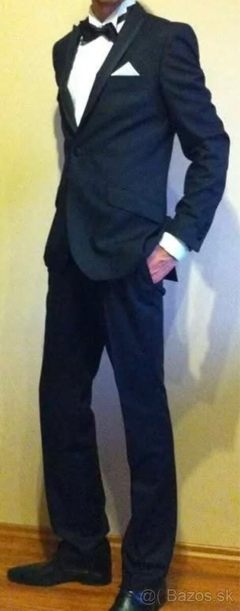 Ako nový slim oblek čiernej farby na vysokú postavu 188 cm, pás 80 cm. Košeľa biela bez fľakov so stojačikom na manžetové gombíky. Grátis pridávam vreckovku a manžetové gombíky.