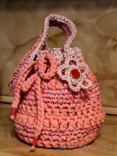 Originál háčkovaný bag čiernobielej farby s obvodom 77 cm a výškou 30 cm za 18 Euro, krásny ružový bag pre dievčatá s výškou 22 cm a obvodom 72 cm za 14 E, pekný farebný bag za 12 E, praktická kabelka so širokým tmavým pásom a dlhou háčkovanou rukoväťou za 11 E. Všetky bagy sú háčkované z hrubej látkovej vlny.