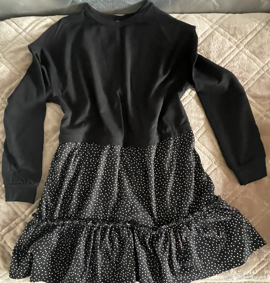 Dámska tunika, alebo minišaty. S dlhým rukávom. Čierna farba s bielymi drobnými bodkami. Značka MOHITO. Veľkosť L/XL. Málo nosená. Rozmery: Dĺžka 89 cm, šírka v podpazuší 2 x 53 cm, dĺžka rukáva od ramena 51 cm, od podpazušia 47 cm. Bavlna. Elastický materiál.
