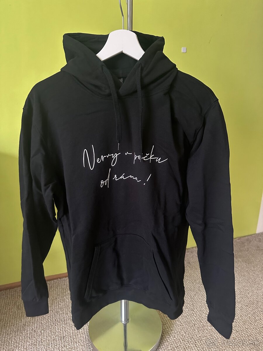 Damska cierna mikina s custom napisom : NERVY V PECKU OD RANA . Znacka : Kariban . Vo velmi dobrom stave, takmer nepouzita, farba stale syta nevyblednuta .