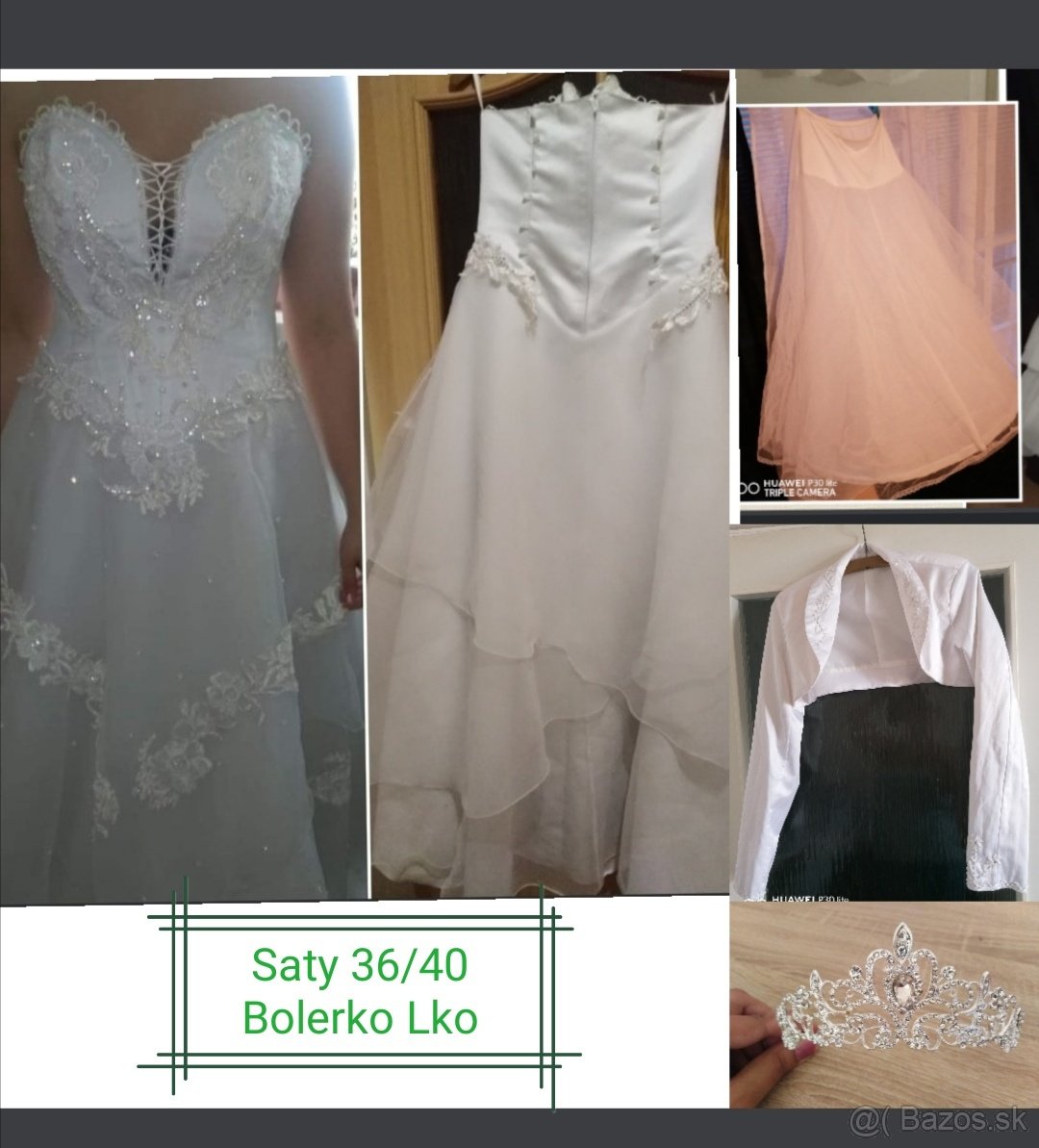 Komplet obsahuje svadobne šaty, kruhovu spodnicku, bolerko, novu korunku