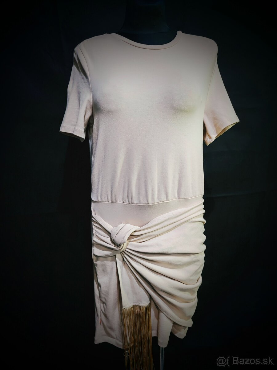 BAVLNENÁ MINI BÉŽOVÁ SUKŇA S STRAPCAMI, KRÁTKY RUKÁV, VIAZANIE .VELKOST L, 90% COTON 10% ELASTAN.V 88CM š 45CM nove bez visačky len šnúrka