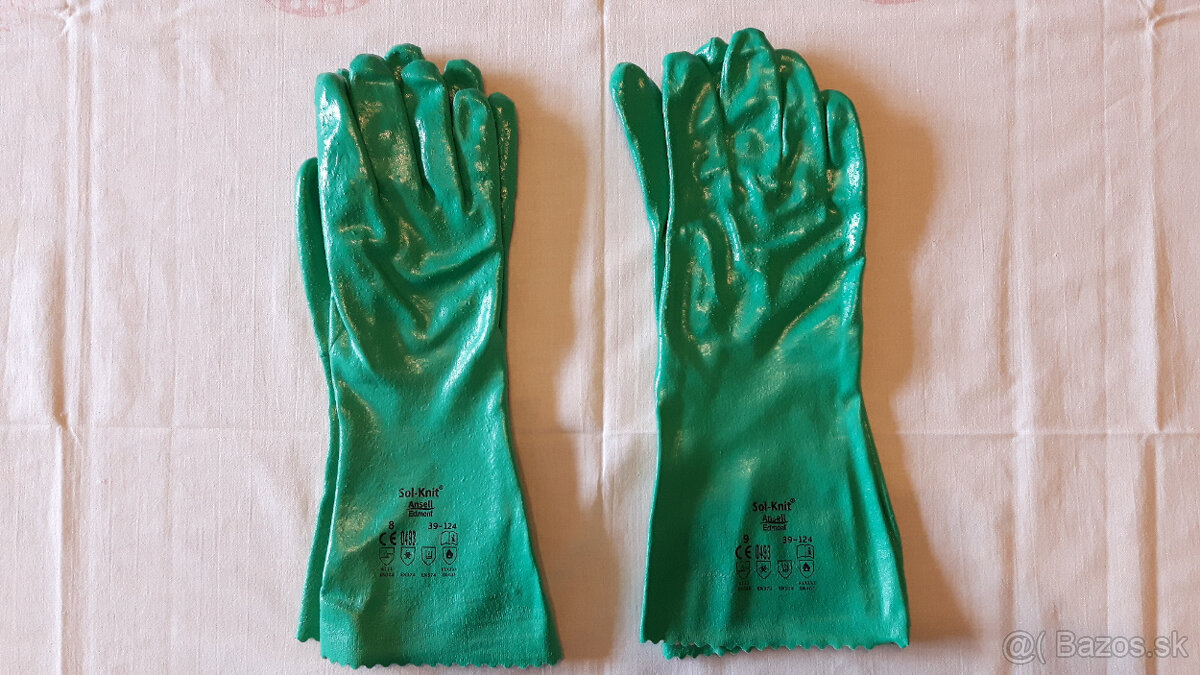 -Zelené rukavice_ Nitrilové rukavice Ansell 39-124 Pracovné chemické rukavice z akrylonitrilu s bavlneným vnútrom.Zdrsnený povrch pre pevné uchopenie za sucha aj mokra