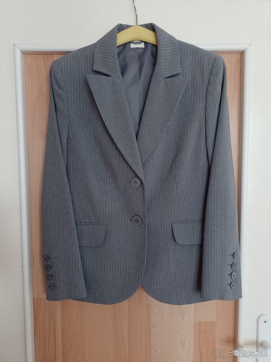 nosený, krásny, nepoškodený. TOP stav. Krásna svetlo sivá látka s jemným pásikom. Miery sú uvedené na fotkách. + Poštovné