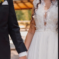 Svadobné šaty - [19.2. 2026]Predám moje vysnívané svadobné šaty s vlečkou (vlečka sa nedá pripnúť). Vzadu majú viazanie na šnúrky, takže sa krásne prispôsobia aj väčšej konfekčnej veľkosti. Nosím veľkosť S a mám výšku 172 cm. Na fotkách mám obuté len tenisky na vyššej platforme.