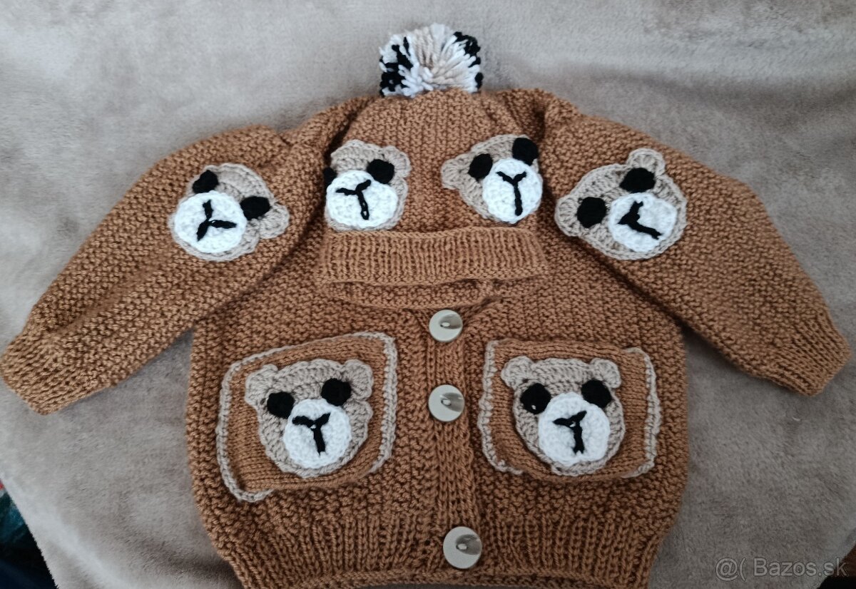 Hnedý sveter s vreckami a medvedikmi,veľkosť ( dĺžka 35cm, šírka 33 CM)+ čiapka.