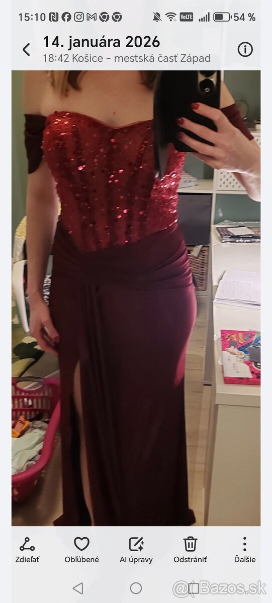 Predám spoločenské dlhé šaty, bordové boli iba vyskúšané, nesadli, kovovo lesklé 2x nosené,veľkosť S, bordové za cenu 40e,kovovo lesklé za 30e, iba osobný odber KE.