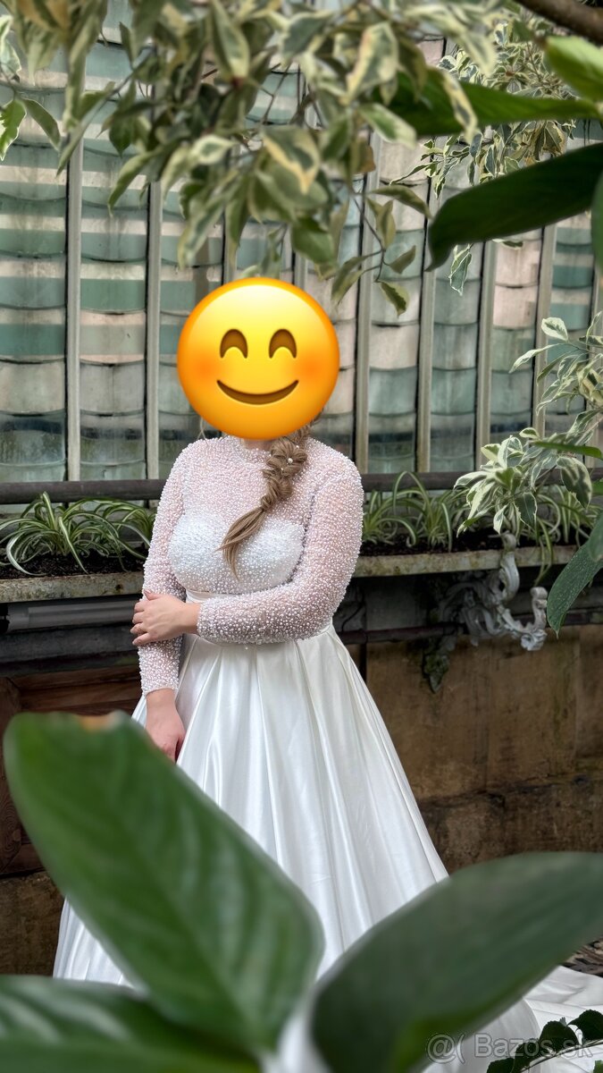 Predam svadobné šaty šité na mieru. Vrch je perličková látka (bola šitá ručne) spodok satén. Šaty maju dlhu vlečku. Budú vyčistené v čistiarni. V prípade rychleho jednania dohoda na cene možná. Mám k nim aj spodničku s vrchom.