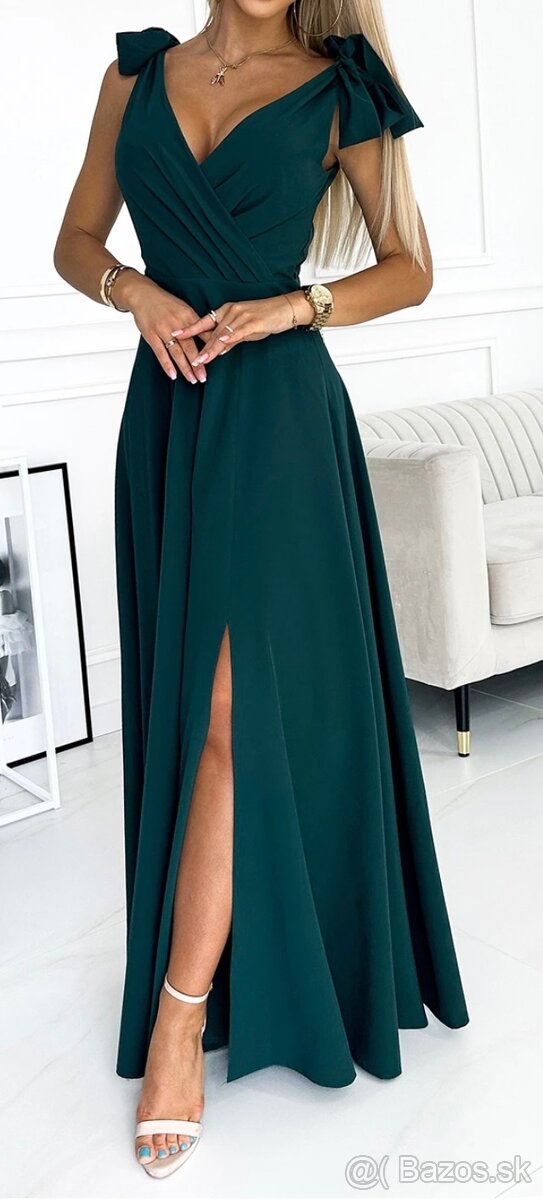 Tmavozelené spoločenské šaty značky Numoco s mašličkami na ramenách veľkosť M. Kupované cez Mia Dresses, pôvodná cena 78,00€.