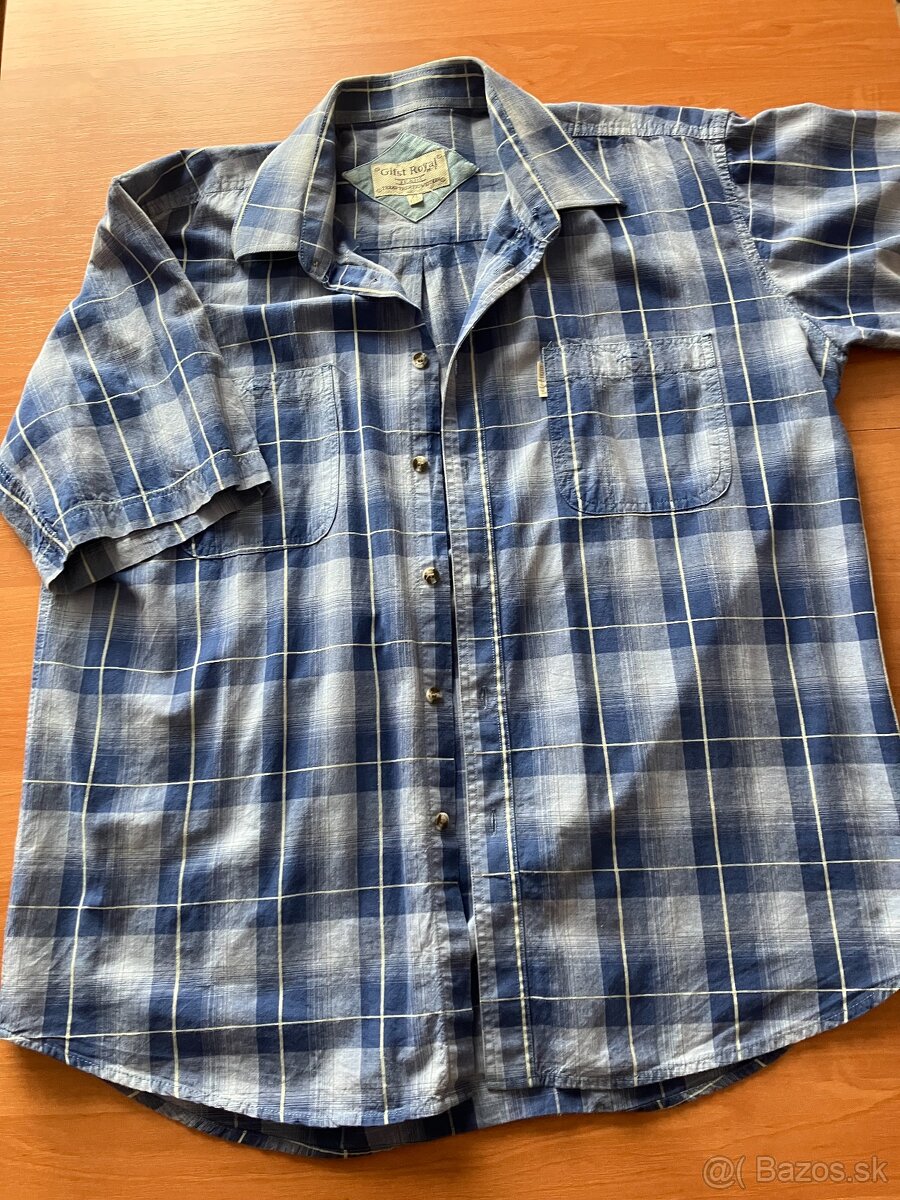 Predám modrú károvanú košeľu, veľkosť č. 43/44. Šírka cez ramená - 56 cm, šírka cez brucho - 134 cm, dĺžka košele - 84 cm. Cena 3 eura + poštovné.