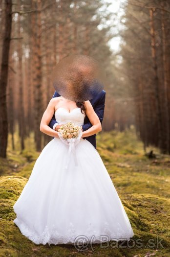 Predám raz použité svadobné šaty, ušité na objednávku, sú na korzet velkosť od cca 34 do 42... šaty sú nepoškodené, vyčistené a vyžehlené, dám k nim závoj + nové bolerko a 6 kruhovú spodničku. Cena spolu 200eur.