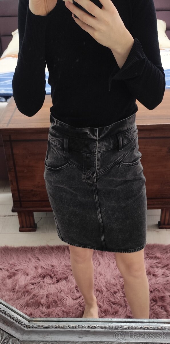 Čierna riflová sukňa po kolená a na gombíky. Nosená 2x. Veľkosť XS a značka Mohito
