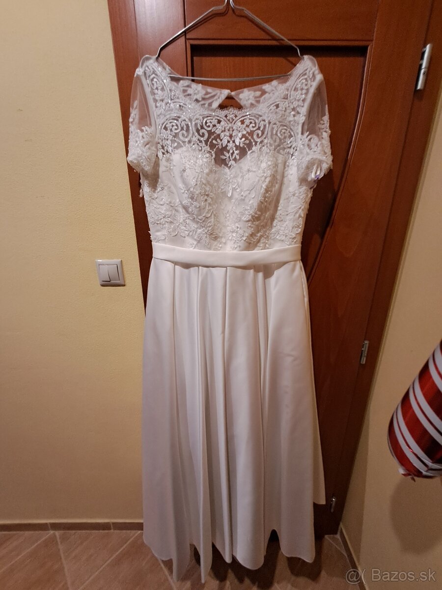 Svadobne saty - [19.2. 2026]Predam svadobne saty velkost 34 - 36 na vysku 160 cm plus podpatky 5 cm. Oblecene 1x. Top stav