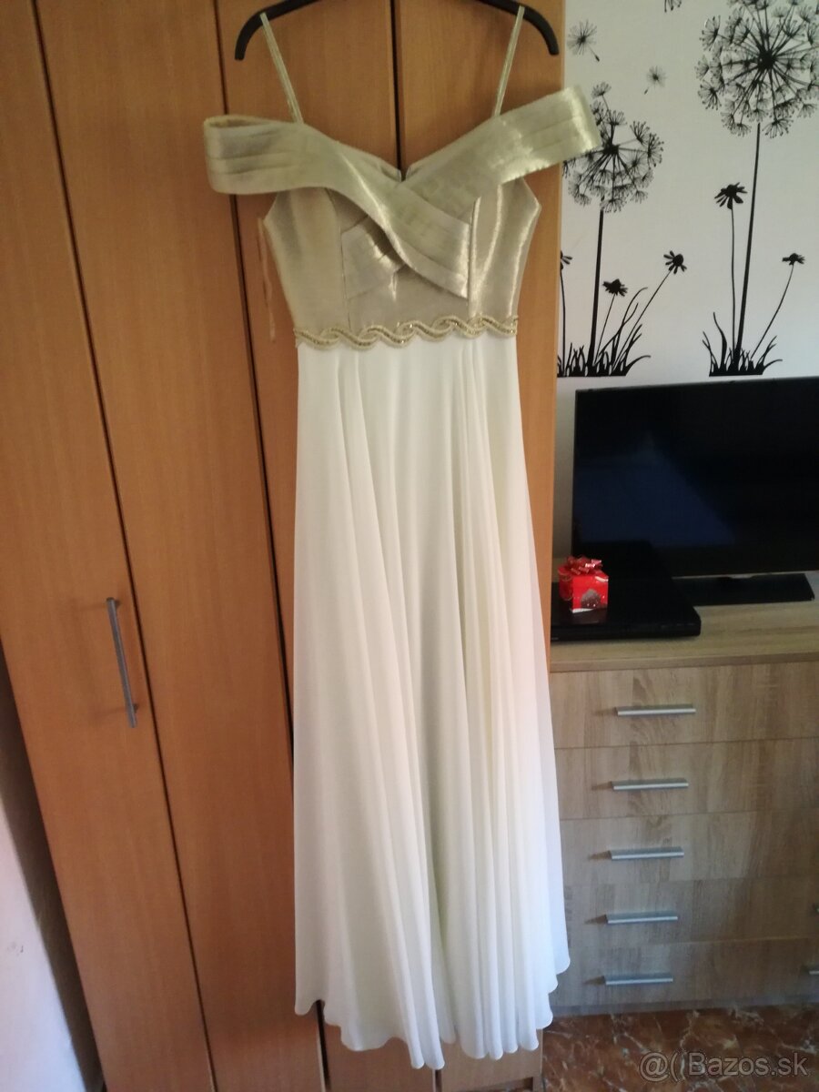 Predám nové spoločenské šaty exluzívnej značky RAMONNA- číslo 38, krémovej až zlatej farby s niekolkými spodničkami, celkovo sú na velkosť S/M Dôvod predaja - oblečené len 1x. V cene patrí aj daný obal na tieto spoločenské šaty.