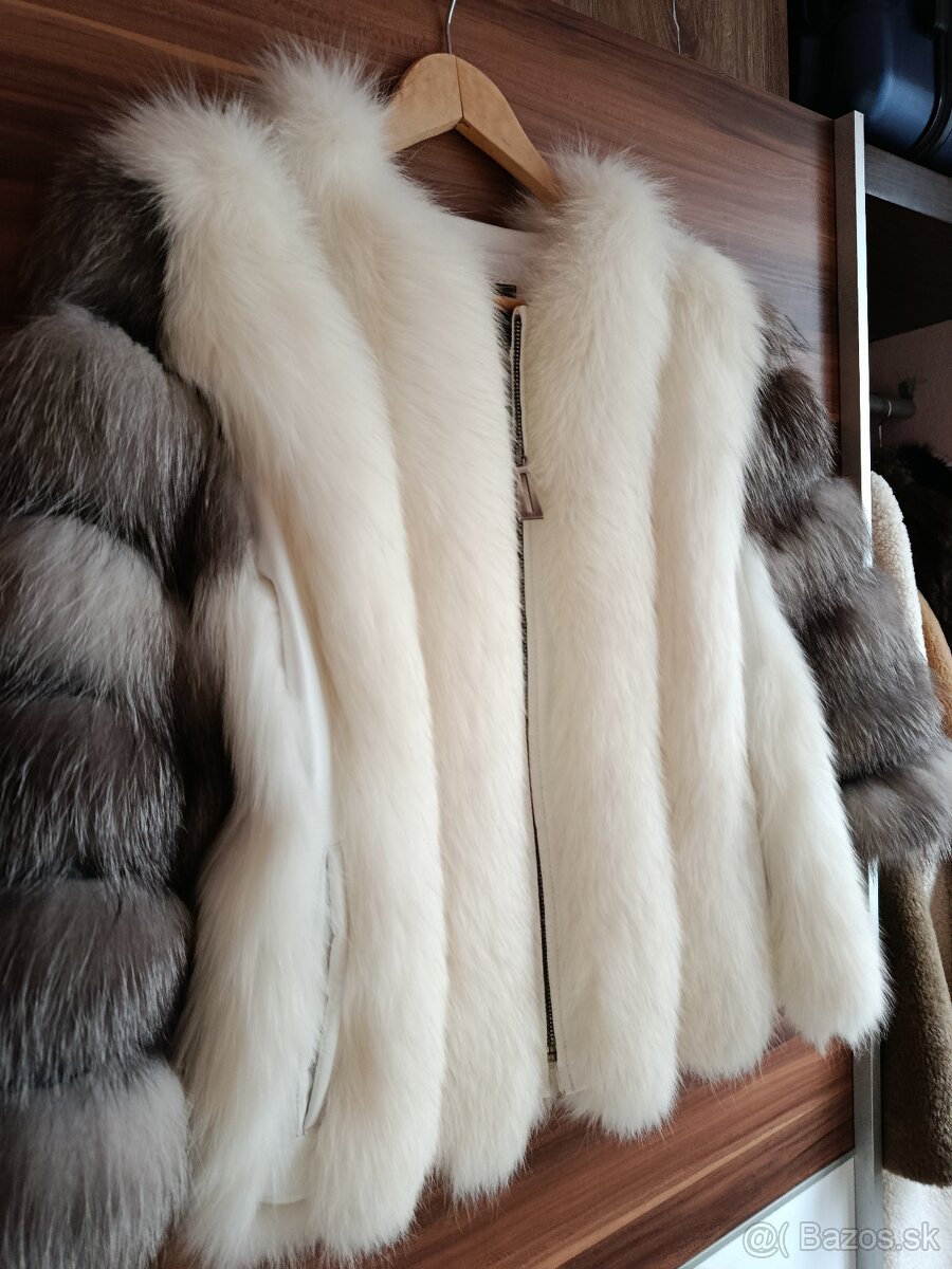 Kožuch z pravej kože a kožušiny z líšky, v kombinácii bielej a sivej farby, ľahučký. Top stav.