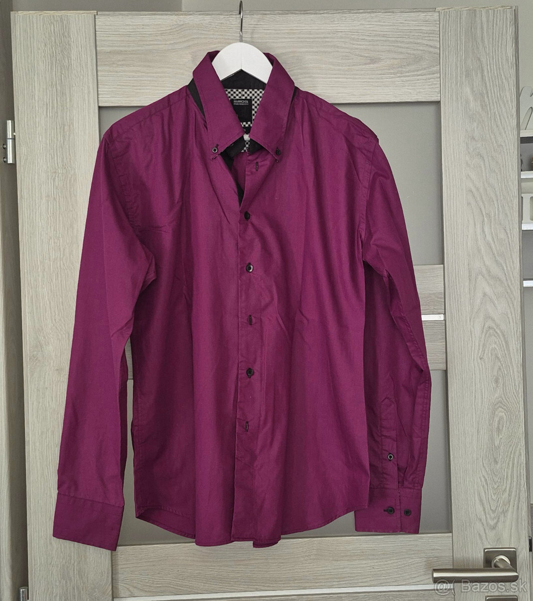 Jara Pánska fialová/bordová košeľa s čiernym pásikom XL 43 - [7.1. 2026]Predám zachovalú pánsku košeľu značky Jara. Rovný strih, spevnený kentský golier, sedlo na chrbte, skosená manžeta na 1 gombík, zaoblený spodný lem, jemný saténový odlesk (foto).