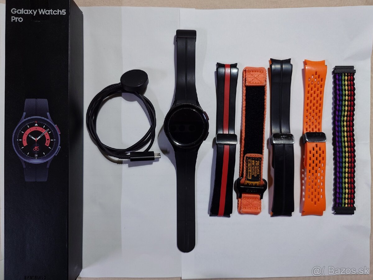 Predám Samsung Galaxy Watch5 Pro, vo veľmi dobrom stave spolu s remienkami a príslušenstvom, batéria mi stále vydrží viac ako dva dni.