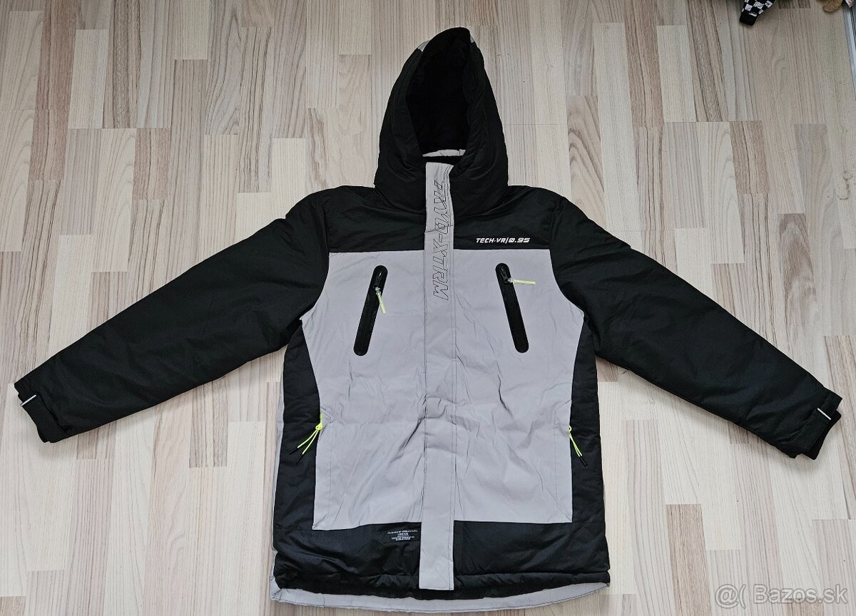 Je zateplená, hrubšia, synovi v nej nikdy nebola zima. Má vyvýšené zapínanie ku krku, sťahovanie na rukávoch, aj dole na bunde, kapucňa pevná.