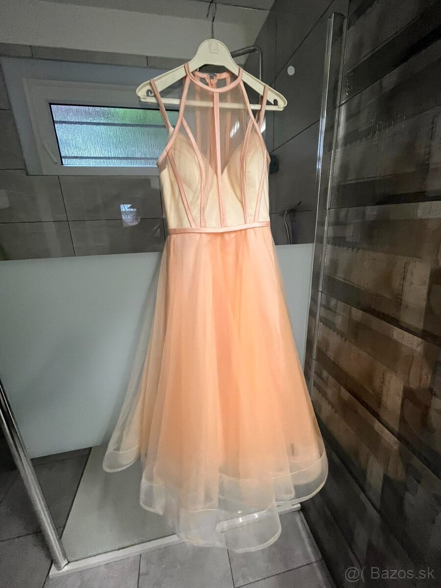 Predám krásne nové nepoužité spoločenské ramienkove šaty marhuľovej farby veľkosť 38. Veľkosť - obvod pŕs max. 90cm, dĺžka od krku 120cm, zvýšený pás . Vhodne na ples, stužkovú