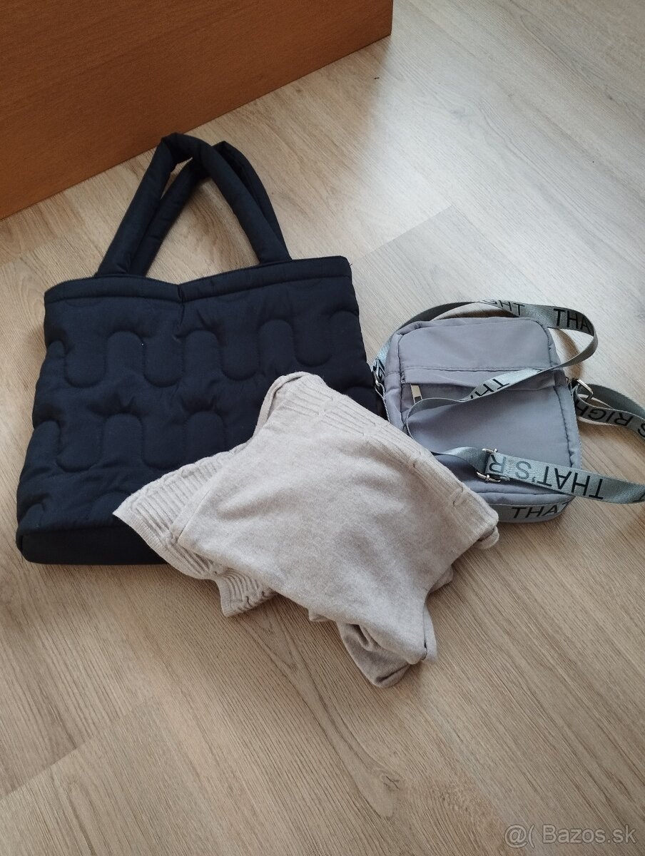 Predám látkovú kabelku väčšiu tmavomodrú, použitú len raz.A sivú taštičku cez plece nepoužitú.K tomu béžový šál.Cena spolu 4 eurá.