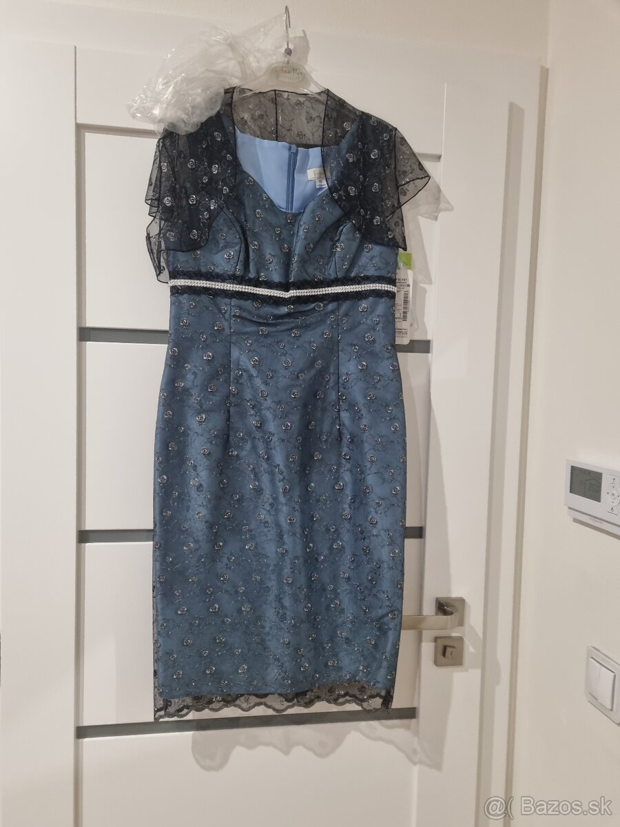 ednofarebná podkladová látka - svetlo modrá - na vrchu prekrytá jemnou priehľadnou krajkou (čierna), s výšivkou drobných kvetov (strieborná), čo vytvára dojem /striebornej/ farby. Strih šiat je tvarovaný na postavu, v páse sú šaty prestrihnuté a dozdobené čiernou krajkou so striebornou aplikáciou pripomínajúcou štras. Šaty sú bez rukávov a sú doplnené krátkym bolérkom s mini rukávmi, z rovnakého krajkového materiálu, avšak bez podkladovej farebnej látky. Šaty sú podšité, rozparok a zapínanie je na dlhý zips vzadu. Veľ. 40. Dĺžka šiat je cca 101 cm, h-95 cm. pás 80 cm, Boky - 102 cm. Šaty sú nové. Pôvodná cena šiat je 45 Eur.