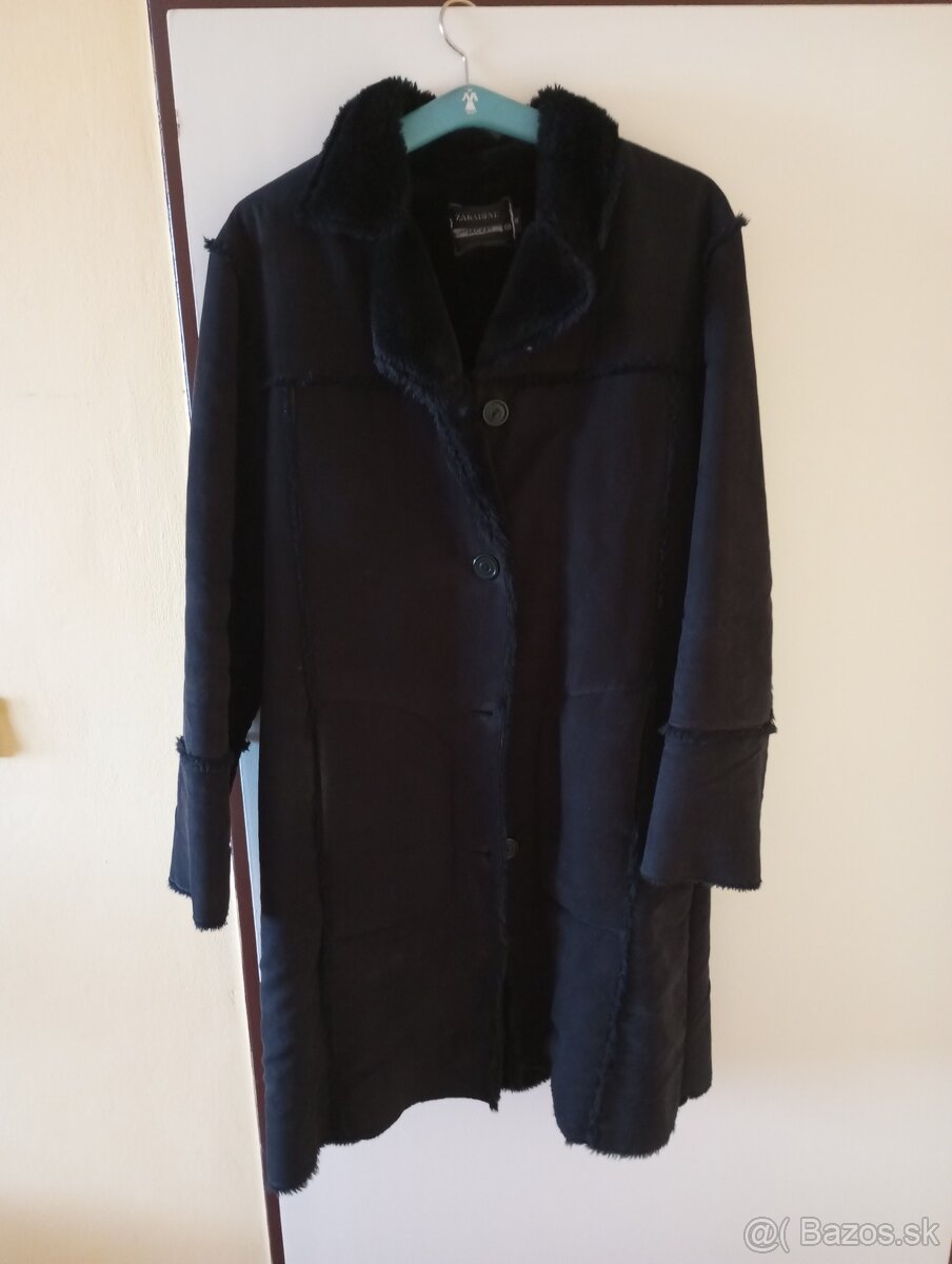 - kožuch, väčší rozmer, odhadom 44-46, dĺžka 110 cm. Okolo krku zvnútra miestami odretý. Cena: 6 €