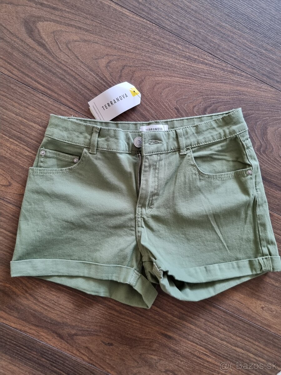 Krátke nohavice vojensko-zelenej farby značky Terranova. Nové, nenosené s visačkou. Veľkosť EU38. Zloženie 98% bavlna a 2% elastan. Pôvodná cena 16€. Poštovné nie je súčasťou ceny. Poprosím kontaktovať iba mailom.