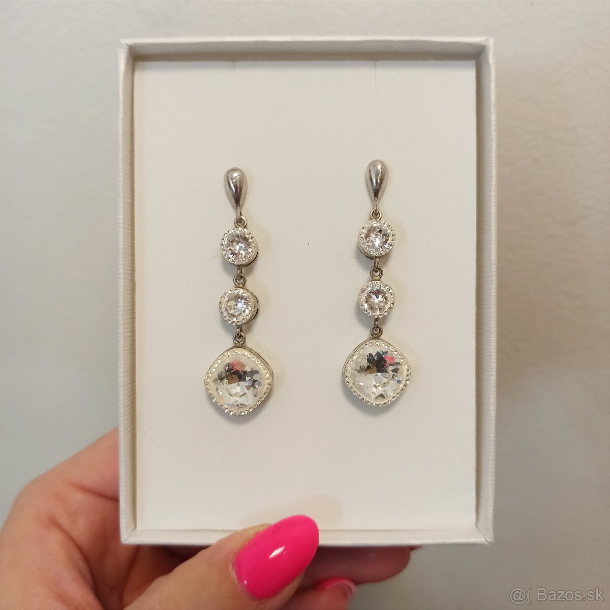 Strieborné náušnice so Swarovski kryštálmi. Zapínanie - šrubovacie s tesnicou gumičkou. Striebro je rhodiované a vytvára alergie. Plus certifikát