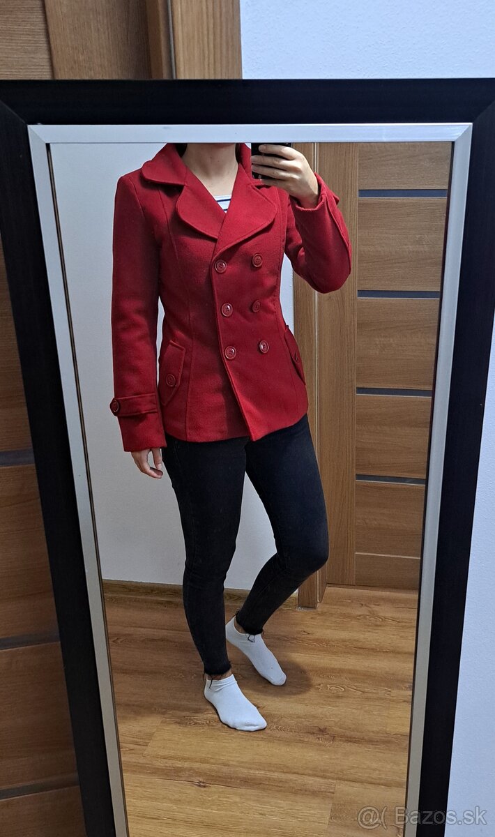 Dámsky kabát bez poškodení, málo nosený, tmavá červená farba, veľkosť S, kapucňa sa dá odopnúť