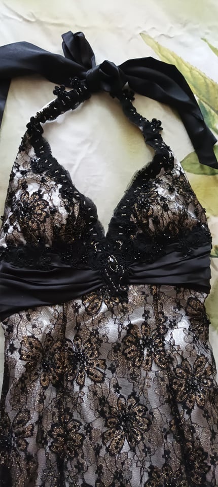 Predám spoločenské šaty s vlečkou. Šaty sú z čiernej čipky, podšité bielym saténom. Zaväzujú sa okolo krku čiernou hodvabnou látkou.Pod prsiami majú sedlo s vyšivanými gorálkami. Šaty sú na veľmi štíhlu postavu cca 168 cm vyška.