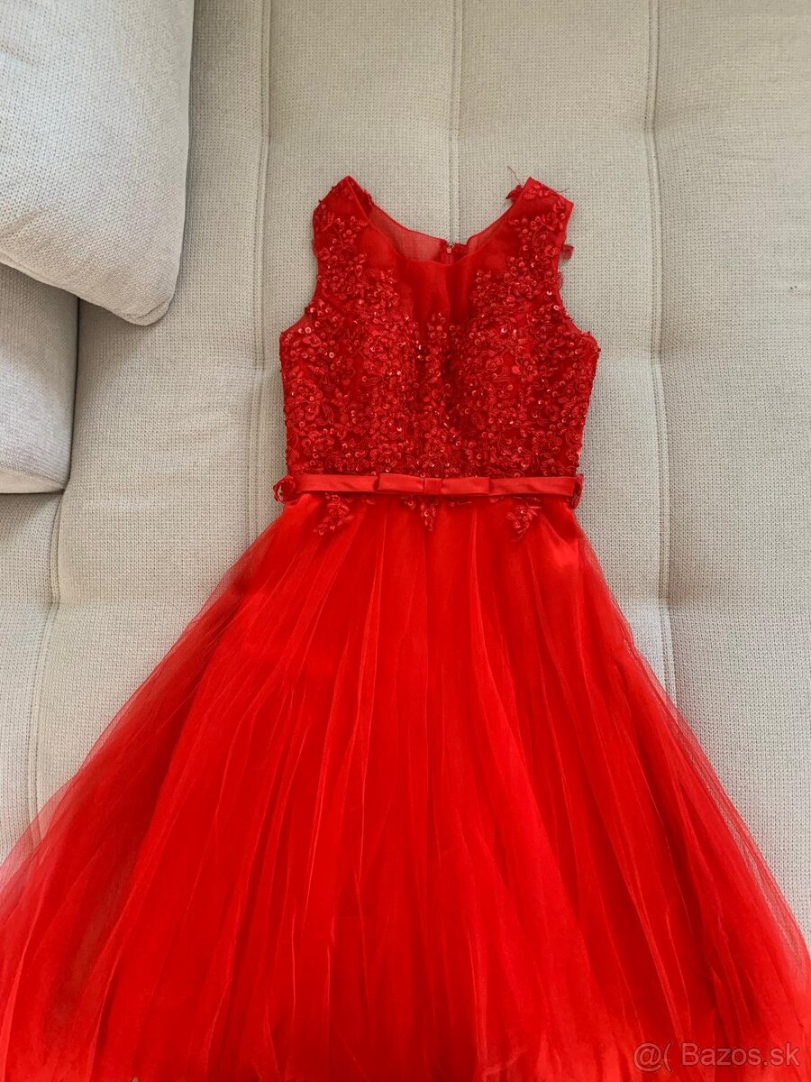 1 x oblečené spoločenské šaty. V páse ozdobná stužka. Vrchný diel je glitríkový, nepotrebujete žiadne výrazné doplnky, vystužená podprsenka je súčasťou. Spodná časť je šifónová bohatá sukňa. Ja mám výšku postavy 168 , s lodičkami mi boli akurát. Dlžka sukne je 110 cm (104 cm sukňa + 6 cm ten šifon), ostatné rozmery sú na foto. Zadná časť je tiež s glitríkmi, zapínanie na zips až po pás. Pôvodná cena bola podstatne vyššia. Ja už nevyužijem - nech slúžia ďalej