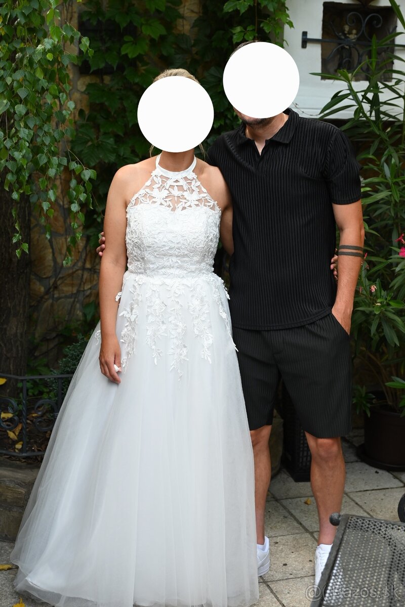 Predám svadobné šaty vo veľkosti 38. Šaty sú na výšku 165 cm + 8 cm podpätok. Šaty boli raz oblečené,sú profesionálne vyčistené a bez poškodenia. Šaty sú na zaviazanie okolo krku,chrbát majú holý,viď fotky.