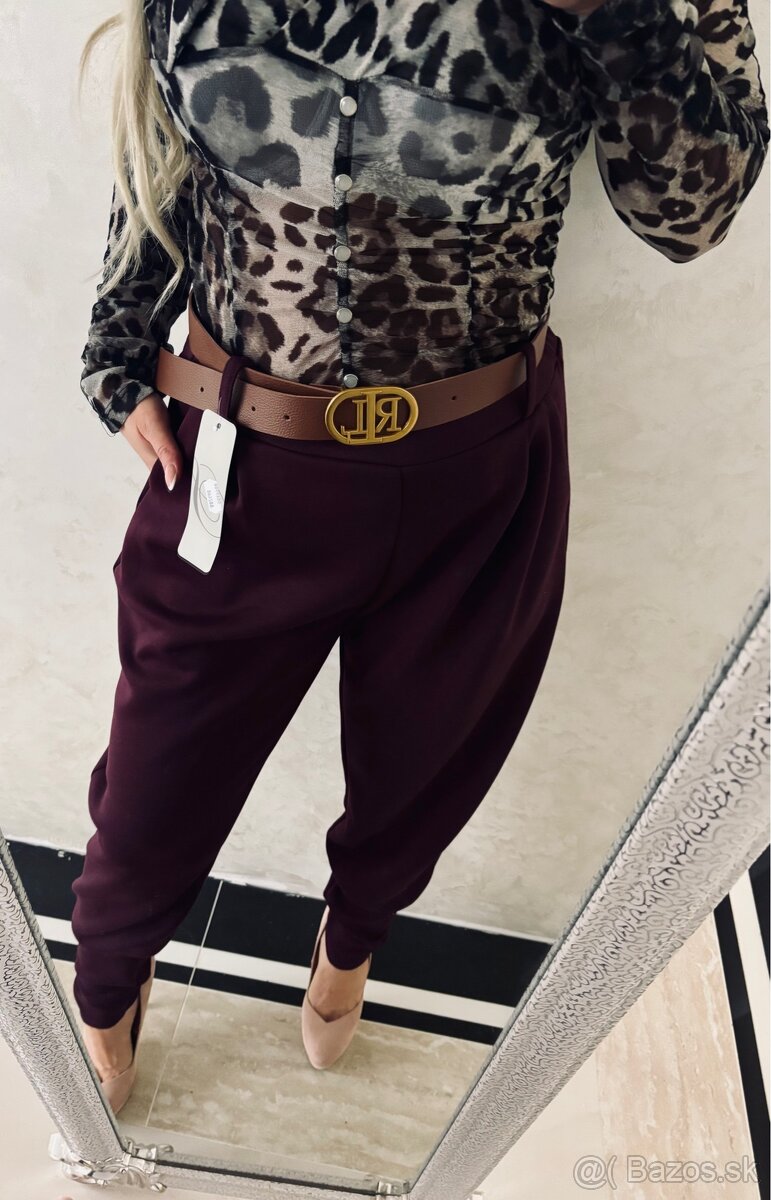 Damske super pohodlne nohavice bordovej farby, doplnene opaskom. Nohavice su voľne ,na lytkach sa zužuju. V pase do gumičky.