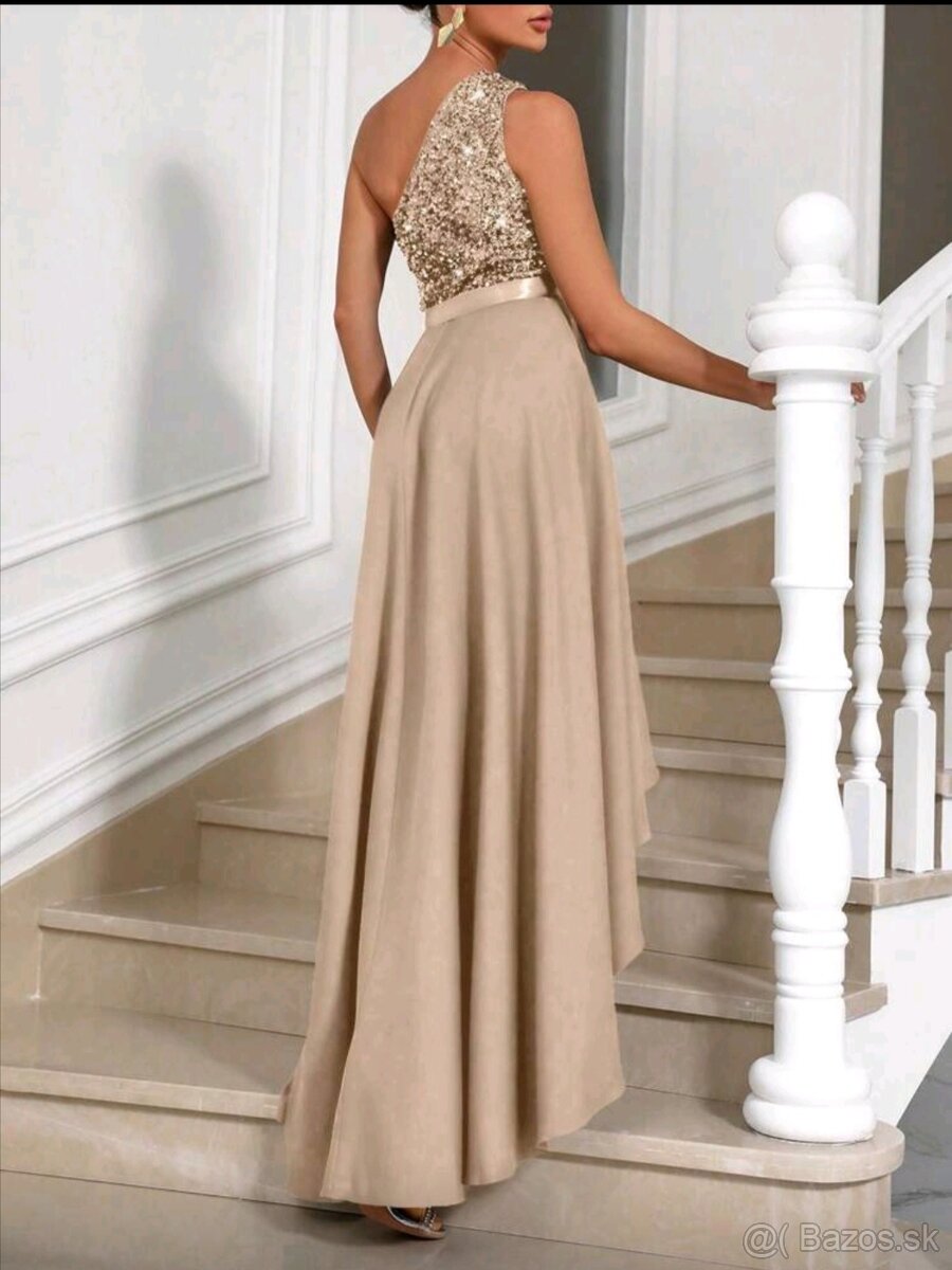 Predám spoločenské šaty farba šampanské,veľkosť M ale su vzadu na šnurovanie čiže sadnú aj veľkosť S-L.Oblecene len raz
