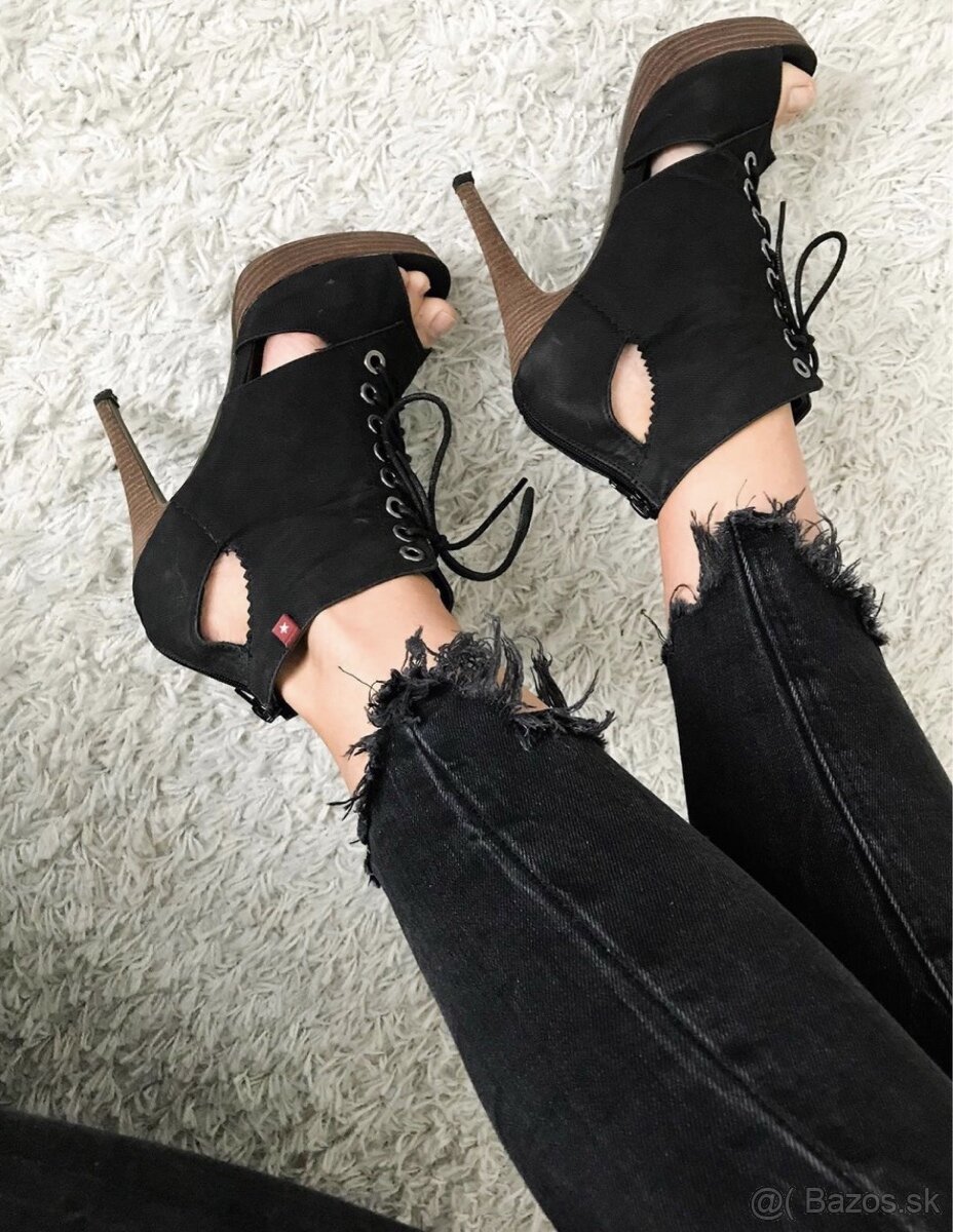 Sandále na opätku, material riflovina, výška opätku 12 cm, výška prednej platformy 2 cm, len raz obuté sú ako nové.