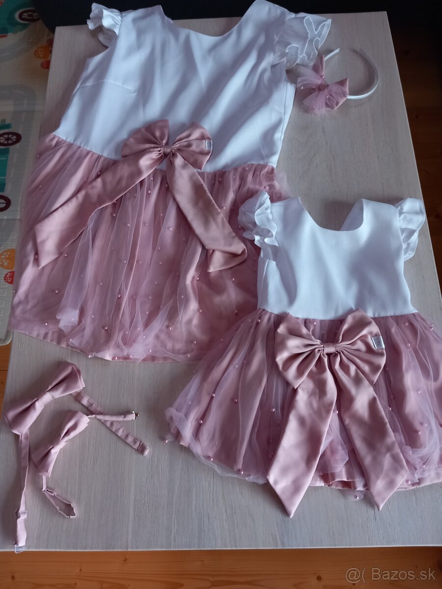 Ponukam Šaty velkost cca 160-165cm vysoku,velkost cca s-m/šatky na cca 2r.princeznu aj s čelenkou + motylik pre partnera/ocina+mala pre dieťa-syna.Viac info poskytnem po tel.pripadne rozmery...na šatkach pre dievča su 3 male jemne fliačky od torty(nie su vyrazne) ,ktore neisli po foteni vyprat.Samozrejme retuš odstrani..su jemne.Málo vidno...najlepsie osobne prevzatie, ale vieme aj odoslat.