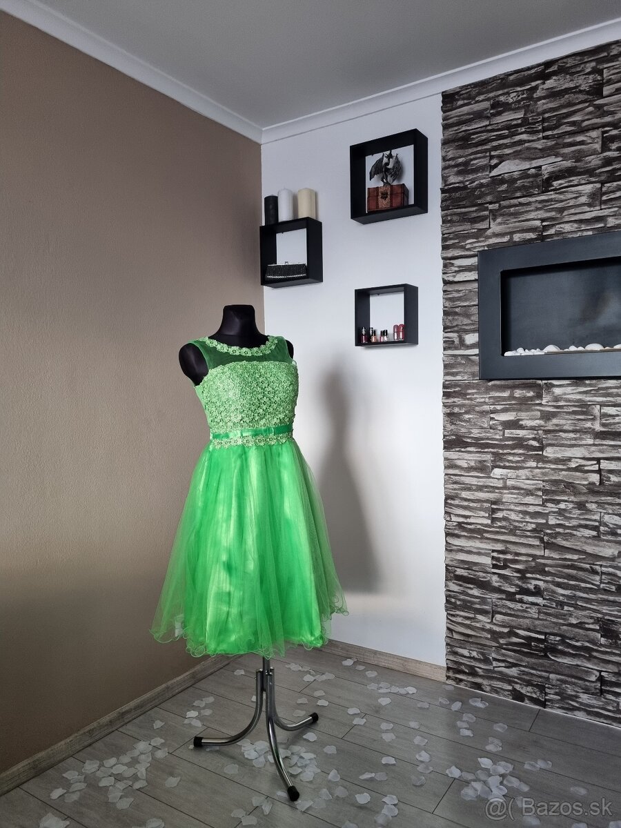 Krátke šaty v hráškovo zelenej farbe. Sú vo veľmi jedinečnom prevedení čipky ,tylu, saténu v hornej časti zdobené jemnými flitrami. Šaty majú hrubšie ramienka . V zadnej časti majú gum. chrbát, čo umožní veľmi dobre sa prispôsobiť všetkým typom postáv. Spodná časť šiat sukne je satén ,vrchná tyl v dvoch vrstvách .